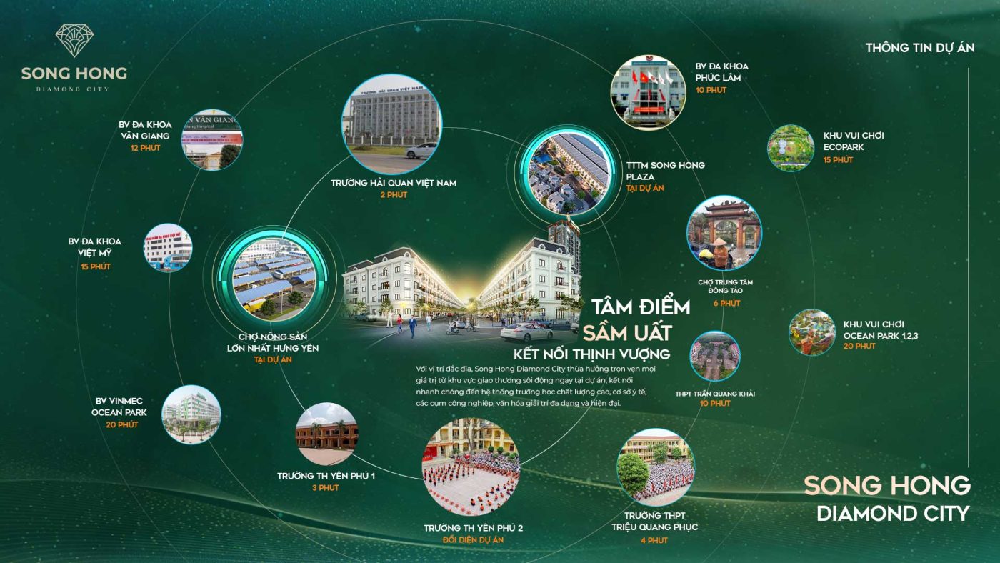 Tọa lạc tại vị trí đắc địa khu đông Hà Nội, Sông Hồng Diamond City dễ dàng kết nối đến các Vành đai 4, Vành đai 3.5, Cao tốc Hà Nội – Hải Phòng, Cao tốc Hưng Yên – Thái Bình, Vincom, Aeon Mall Ocean Park 2, KĐT Ecopark và các trục đường huyết mạch. Nhờ vậy, cư dân vừa được tận hưởng nhịp sống hiện đại, vừa tiết kiệm tối đa thời gian di chuyển.